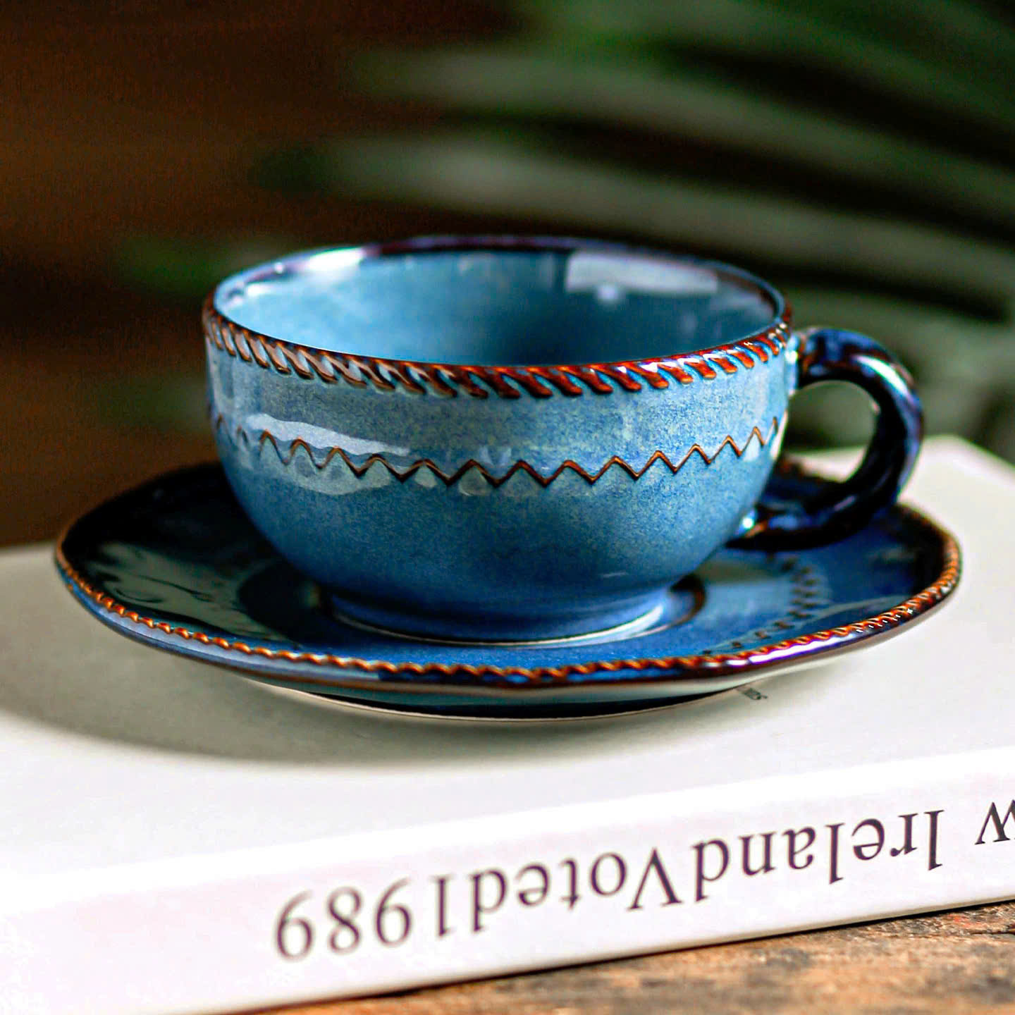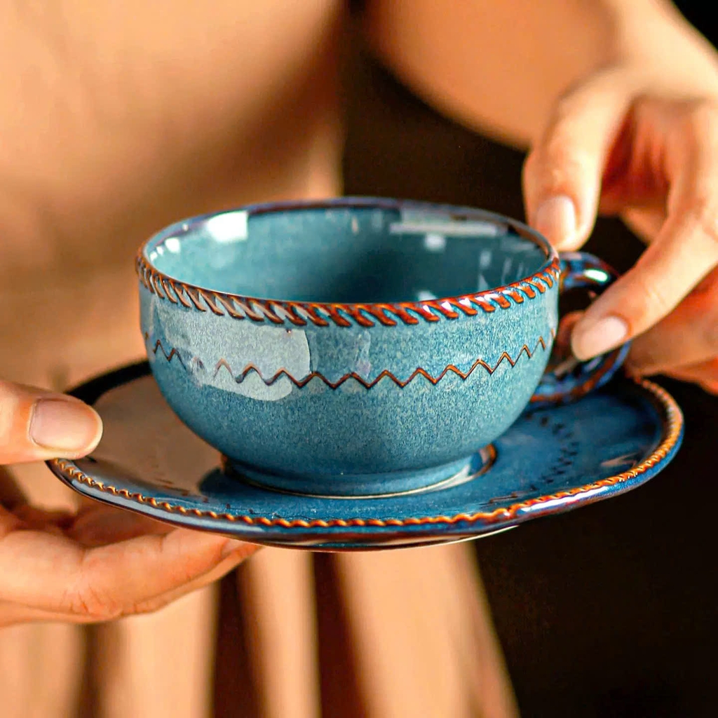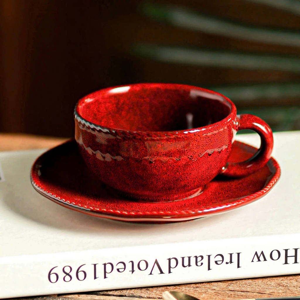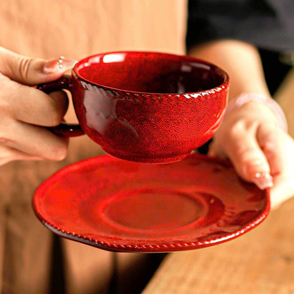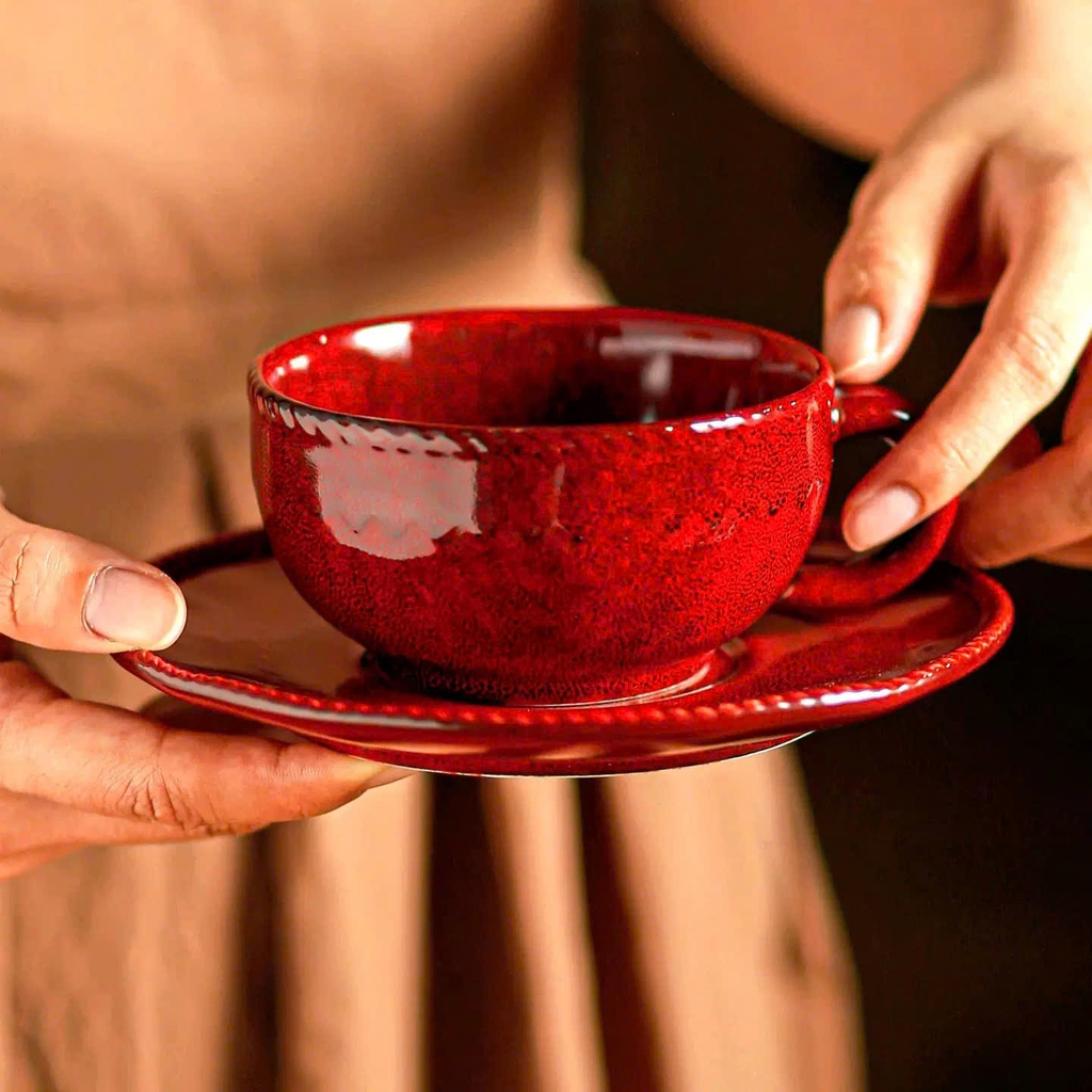 Bộ tách Capuchino đỏ rực lửa – sự giao thoa hoàn hảo giữa nghệ thuật gốm nung thủ công và phong cách thưởng trà hiện đại.